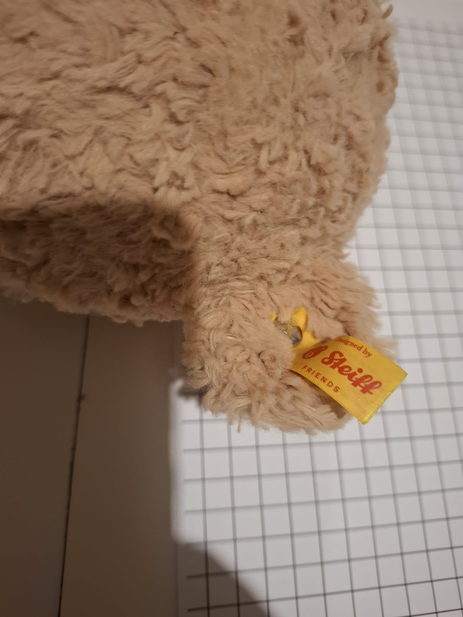 Orsacchiotto di peluche del marchio Steiff, linea Friends. L'etichetta indica "signed by Steiff FRIENDS". Il peluche è di colore marrone chiaro e sembra in buone condizioni.